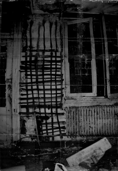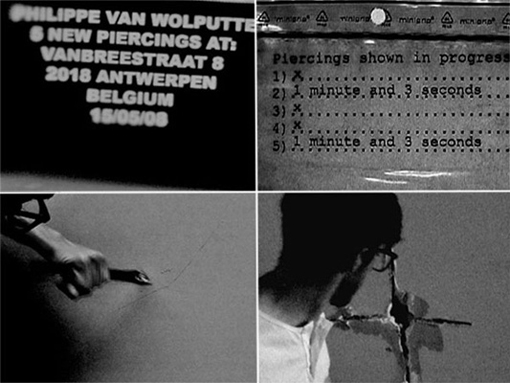 p10-076 / Five New Piercings / 2008 / collage with 2 black and white photographs, mounted on plexiglass, and a DVD of the performance / 40 x 25 cm (60 x 45 cm) / dvd 2’31” / editie 1-4 + 1 AP / provenance: the artist and Galerie Wilfried Lentz, Rotterdam / pk