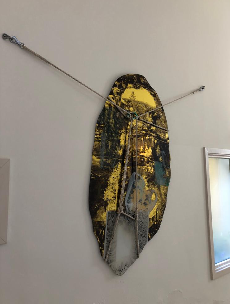 Navid Nuur p21-183 / Zonder titel / 2016-2020 / laminated glass collage, climbing carabiner, bolt hangers, tree swinging rope / 93 x 166 x 11 cm / provenance: Galerie Martin van Zomeren, Amsterdam / pk navidnuur.net