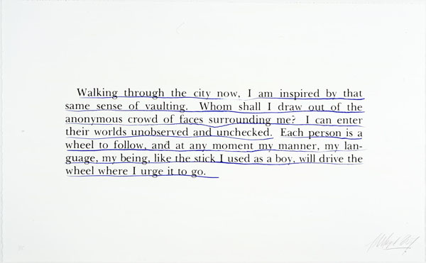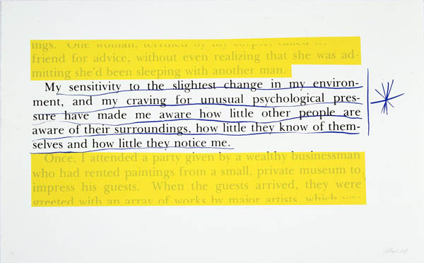 p11-097 / The Kosinksi Quotes – My Sensitivity / 2008 / out of a series of 9 silkscreens, # 1 in an edition of 15 + 2 AP / 112 x 70 cm / provenance: the artist and Yvon Lambert Gallery, New York / exhibited at Article 12, apr-jun 2008, Stroom, Den Haag; The Thicker The Glass, mrt 2009, Yvon Lambert Gallery, Paris; Authority To Remove, sept-dec 2009, Tate Modern, London / pk