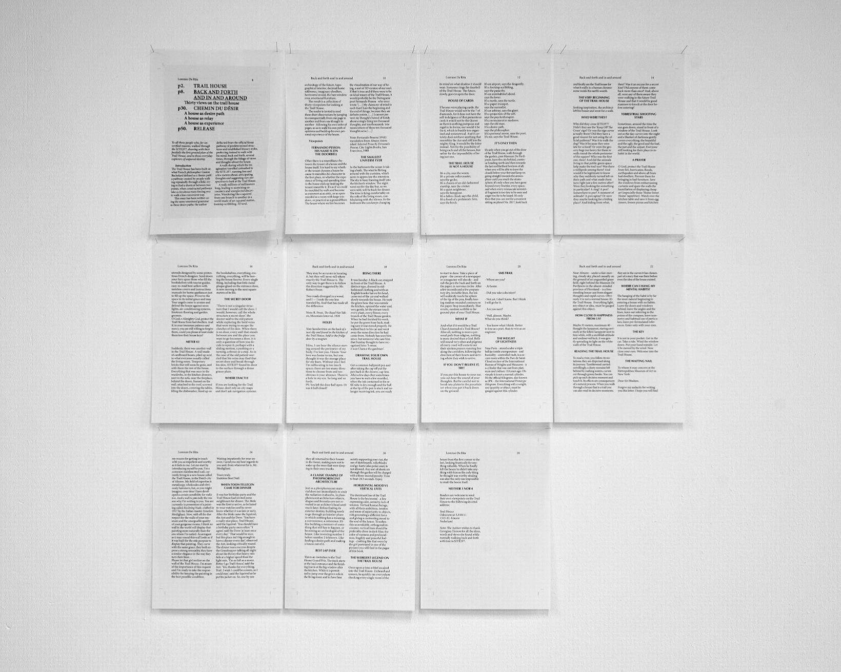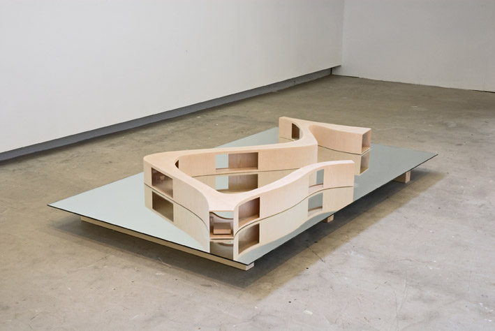 p14-115 / Trail House / 2009 / consists of 4 parts: (1) instructions with line drawings and measurements on A3 sheets to execute the Trail House: a 100 m2 house that is based on the paths of a vacant piece of land, (2) model on scale 1:20 made of birch plywood, foam and mirror glass, (3) two photos #2 out of an edition of 3, in a series made by Bas Princen, (4) text ‘Back and Forth and in and around: thirty views on the Trail House’ on 11 A4 sheets written by Lorenzo De Rita / size of model: 110 x 190 x 20 cm, photographs: 67 x 83 cm / provenance: the artist / exhibited at Unknown Territories, aug-nov 2009, Museum De Paviljoens, Almere, and at Speak, Memory, dec 2010-feb 2011, Stroom Den Haag / pk