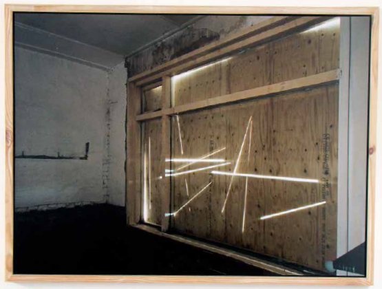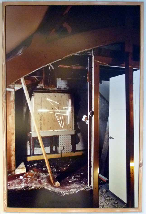 p14-124 / GDOHBB, Kitchen (Goedendag – One Hot Blue Ball) / 2007 / unique analog photo print with special frame / 94,5 x 71 cm / one photo out of nine, made of the intervention that was part of the demolishing of De Groots former house (Motel Nooitgedacht in IJmuiden) in 2007. The project consisted of three acts: an intervention (Prologue), a performance (Masterplan) and a Tattoo (Epilogue). After De Groot left the house, which was to be demolished, it was boarded up with wooden plates to prevent people to enter the house. For the prologue De Groot used his circle saw to make saw cuts in the wood that covered the windows. Together with photographer Johannes Schwartz he documented this intervention in nine photographs from both the inside and the outside of the house. The wood of the house was used for the frames of the photographs / provenance: the artist / pk