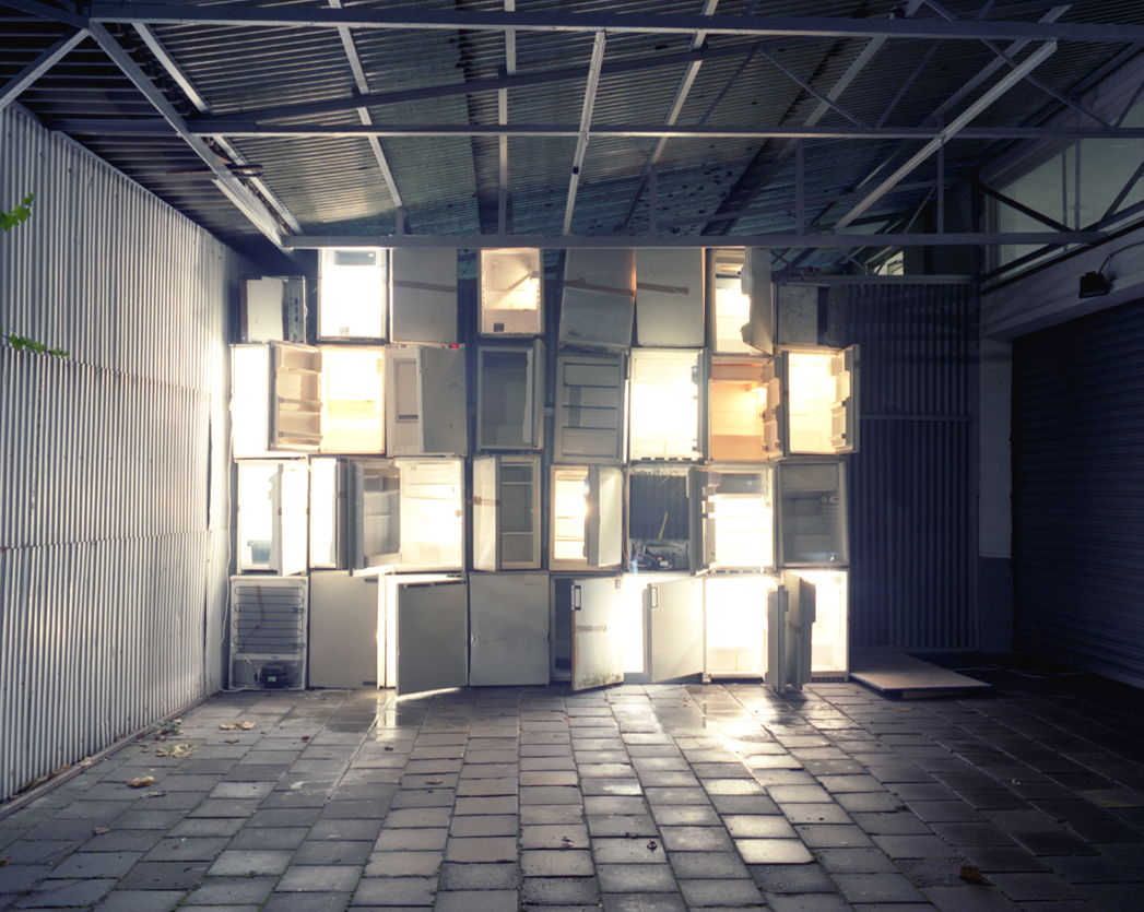 p06-017 / The stacking man has never been homeless / 2003-6 / duratrans photo on light box / #2 in an edition of 3 / 124 x 101 cm / provenance: Deiska, Amsterdam / pk